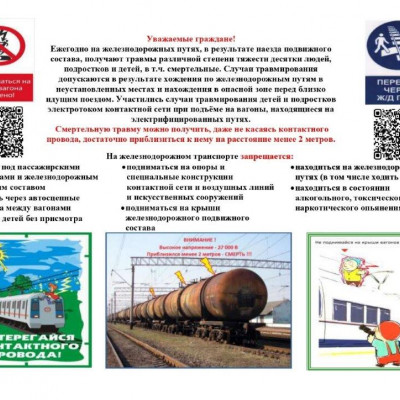 - находясь рядом с железнодорожными путями, при приближении поезда отойдите на безопасное расстояние!