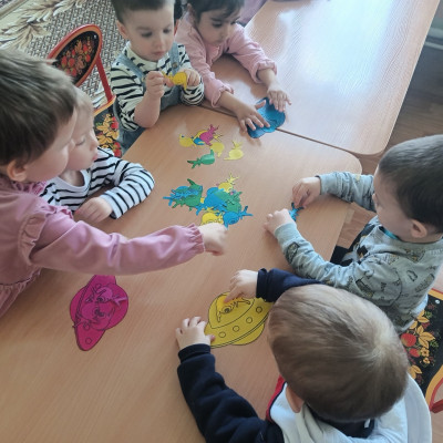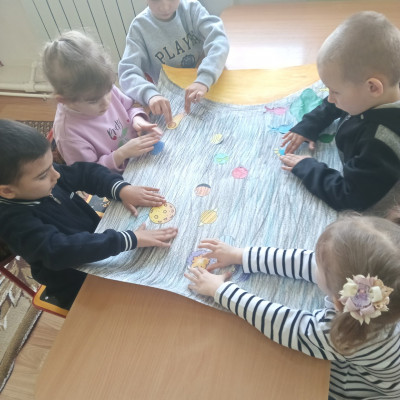 Дети узнали, кто такие космонавты и на чем они летают в космос. Играя в дидактическую игру «Что возьмем в космос», ребята правильно выбрали, какие костюмы космонавты носят – скафандр. Как зовут первого космонавта - Юрий Гагарин. Воспитанники были удивлены, что не только люди летали в космос, а также собаки Белка и Стрелка. Знания, полученные в течение тематического дня, дети закрепили в коллективной творческой работе " Солнечная система".