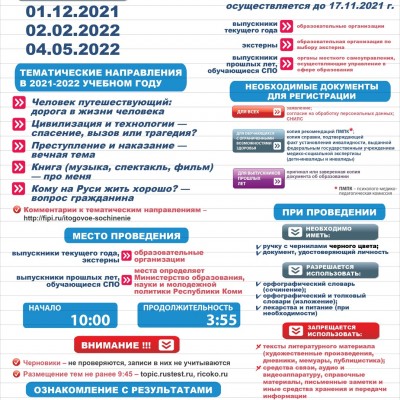 Сочинение оценивается по системе «зачет»/«незачет». Обучающиеся, получившие неудовлетворительный результат «незачет», не явившиеся на итоговое сочинение (изложение) или не завершившие его написание по уважительным причинам, смогут написать сочинение в дополнительные сроки: 2 февраля 2022 года и 4 мая 2022 года.