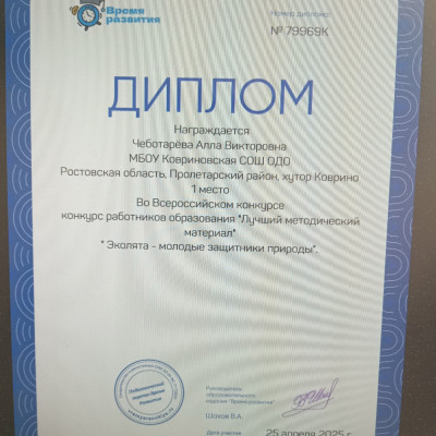 Чеботарева А.В., всероссийский конкурс конкурс работников образования " Лучший методический материал", победитель.