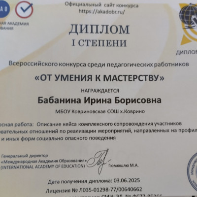 Бабанина И.Б.- всероссийский педагогический конкурс "От умения к мастерству", победитель.