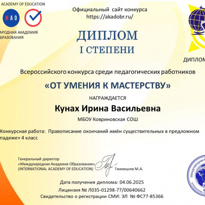 Кунах И.В.- всероссийский педагогический конкурс "От умения к мастерству", победитель.