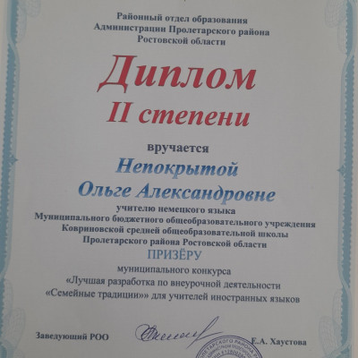 Непокрытая О.А.- конкурс педагогического мастерства "Лучшая разработка внеурочного занятия "Семейные традиции" по иностранному языку", победитель.