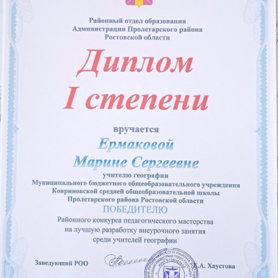 Ермакова М.С. - "Конкурс педагогического мастерства на лучшую разработку внеурочного занятия среди учителей географии", победитель.