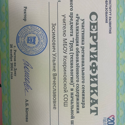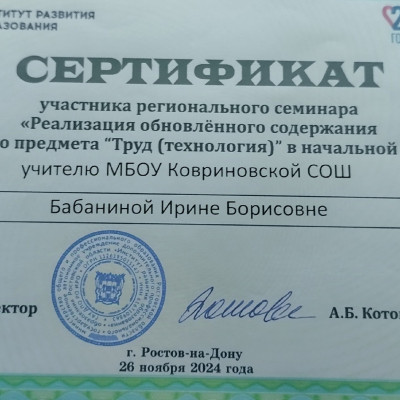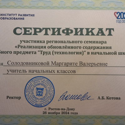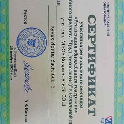 С 1 сентября 2024 года вступил в силу приказ Министерства просвещения РФ от 22 января 2024 г. № 31, согласно которому предмет «Технология» был переименован в «Труд (технология)». Помимо нового названия, предмет получил новый статус, обновленные содержание и перераспределение часов в модулях. 26 ноября учителя начальных классов приняли участие в онлайн семинаре на платформе Сферум, проводимый кафедрой социальных коммуникаций и технологий ГАУ ДПО РО ИРО. В рамках семинара были рассмотрены вопросы реализации проектного метода на уроках труда (технологии) 1-4 классов, разработка ситуационных заданий для формирования функциональной грамотности на уроках труда (технологии). Руководитель ШМО начальных классов Кунах И.В.