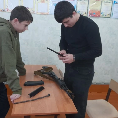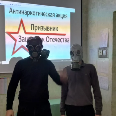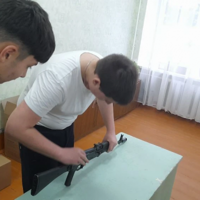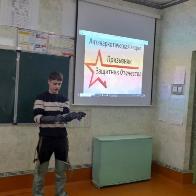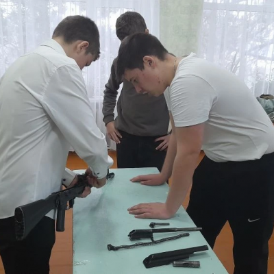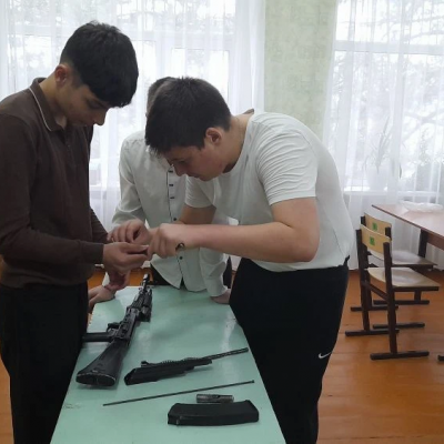 "Призывник - Защитник Отечества". В рамках Общероссийской акции «Призывник — Защитник Отечества», направленной на профилактику незаконного оборота наркотических средств среди лиц, достигших возраста первоначальной постановки на воинский учет, призывников и военнослужащих, выявление при призыве, поступлении на военную службу по контракту и в военные образовательные организации граждан, допускающих немедицинское потребление наркотиков среди обучающихся 8-10 классов в рамках кружка "ШВПК" были проведены соревновательные мастер-классы по неполной сборке-разборке АК-74, снаряжению магазина с патронами, надеванию противогазов и ОЗК.