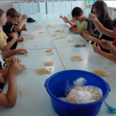 Кипела работа в творческой мастерской. Море восторга вызвало рисование на мокрой бумаге «Пейзаж». Вкусными оказались бусы из макарон; занятным конструирование из газет «Весёлые шапочки».