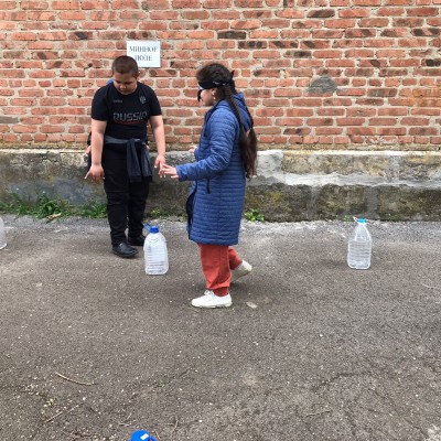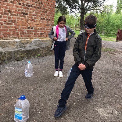 - Станция «Минное поле» (Челядина У.В.) Команда выбирает пару. Два участника с завязанными глазами должны были пройти по минному полю и не подорваться, руководить их движением должна вся команда. Все ребята прошли препятствие и получили баллы.