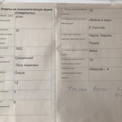Психологическую акцию «Следопыт» провела Кадырова Н.В. с целью знакомства с организацией работы и особенностями школы; стимулирование межличностного взаимодействия между учащимися и работниками школы. Ребята обучались навыкам коллективной самоорганизации; развитие коммуникативных умений; сплочение детского и общешкольного коллектива; поднятие общего эмоционального тонуса; психологическая поддержка отдельных членов детского или взрослого коллектива; За время акции они не пользовались телефонами а тесно общались.