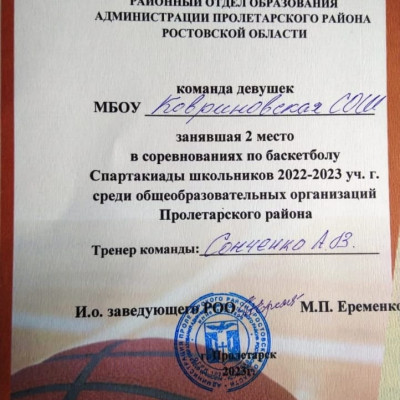 1 февраля 2023 года в рамках районной Спартакиады школьников в городе Пролетарске прошли соревнования по баскетболу между девушками сельских школ. Команда нашей школы в упорнейшей борьбе завоевала 2-е место.