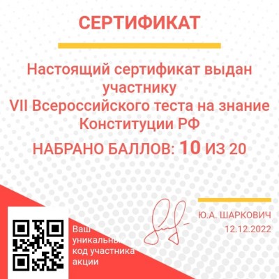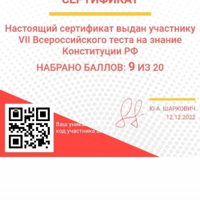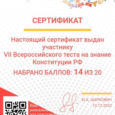12 декабря 2022 года прошел Всероссийский тест на знание Конституции РФ, в котором могли принять участие все желающие, начиная с 12 лет и далее. Наши ребята с 6 по 11 класс проявили активность и поучаствовали в данном мероприятии.