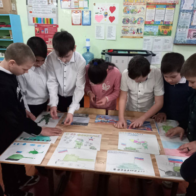 На кружковой деятельности в 4 классе учителем был проведён мастер - класс по изготовлению праздничных открыток и рисунков. Рисунки получились праздничными и красивыми, а ребята приложили свои усилия, проявили фантазию и творчество. Затем, своими рисунками ребята оформили праздничный стенд. Детские старания не пройдут даром, а теплота души, вложенная ребятами при работе, почувствуется всеми.