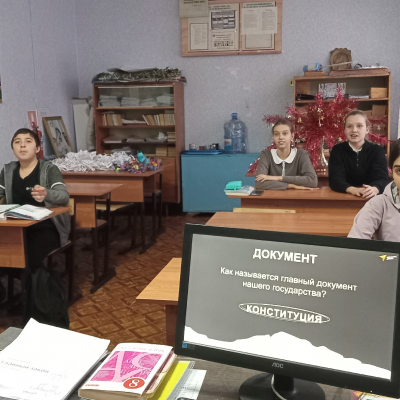 В 7 классе была проведена игра "Что мы знаем о Конституции". Игра проводилась по 5 категориям: а может быть, документ, возраст, обязанности, задание повышенной трудности. За каждый правильный ответ присваивались баллы. Лучше всех знает Конституцию Левина Наташа, она набрала наибольшее количество баллов.