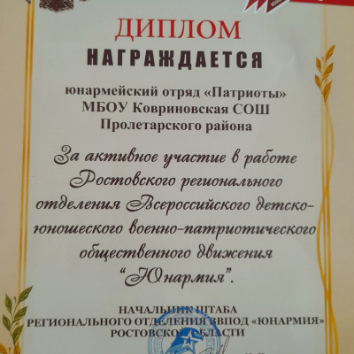 По итогам работы за 2023 год отряд Юнармейцев "Патриоты" МБОУ Ковриновская СОШ и его руководитель -Непокрытая Ольга Александровна, были награждены дипломом и кубком за активное участие в работе Ростовского регионального отделения Всероссийского детско-юношеского военно-патриотического общественного движения "Юнармия ". Поздравляем ребят с наградой и желаем успехов в дальнейшей работе!