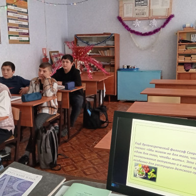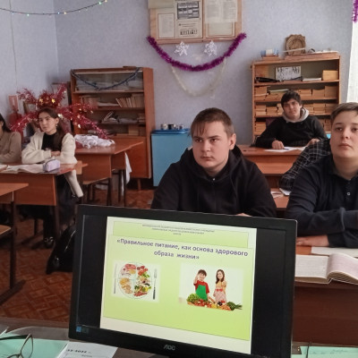 С 11 по 15 декабря в школе была проведена неделя здорового питания. Ковтунова Г.В. оформила книжную выставку «Кухни народов мира» для учащихся 1-10 классов. Классные руководители 1-4 классов провели информационную минутку «О пользе овощей и фруктов», а также конкурс рисунков «Здоровое питание». В 5-6 классах Лукьяненко А.Н. провела игру-викторину «Знатоки правильного питания», а в 7-8 классах состоялась беседа-презентация «Правильное питание как основа здорового образа жизни», проведённая Кошелевой Л.П. Представители родительской общественности посетили школу и провели родительский контроль за организацией горячего питания