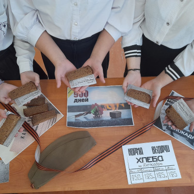 Обучающиеся 5 класса приняли участие во Всероссийской акции памяти «Блокадный хлеб», цель которой - напоминание о мужестве и стойкости мирных жителей Ленинграда в годы Великой Отечественной войны. Блокадный хлеб - это кусочек хлеба весом 125 г. 125 граммов составляла минимальная суточная норма хлеба, который пекли по особому «рецепту» из ячменя, солода, отрубей, обойной пыли, перемолотых березовых ветвей и коры, одним словом, из того, что было доступно. «Блокадный хлеб» - это символ надежды на завтрашний день, который навечно остался в памяти ленинградцев, переживших суровые годы блокады. Ребята просмотрели фильм о Блокадном хлебе и приготовили инсталяцию.