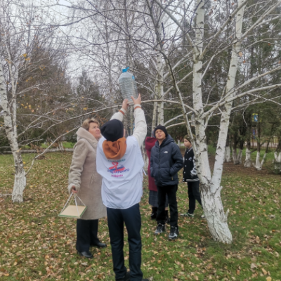 В рамках участия в проекте Добрые уроки, руководитель кружка "Школа волонтёра" Кунах И.В. с волонтёрами провели "Синичкин день" - сделали кормушки и развесили их в школьном парке.