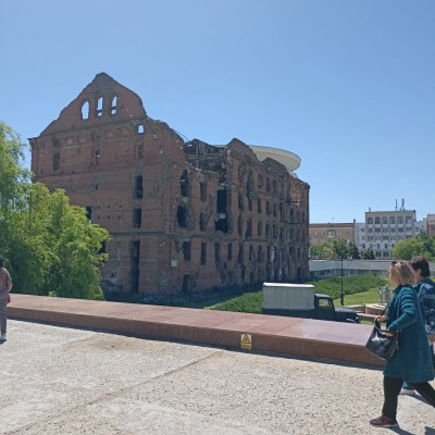 На стенах-руинах высечены клятвы жителей Сталинграда, а также фигуры солдат, изображения танков, оружия. Внутри стен расположены репродукторы, из которых слышны звуки выстрелов и военные песни. Увидели дом Павлова. Здание было разрушено во время Сталинградской битвы, но его решили не восстанавливать, а сохранить как наглядное воспоминание о войне. Рядом с мельницей находится музей-панорама «Сталинградская битва». Здесь мы увидели подлинные экспонаты военного времени, узнали историю Отечественной войны и, в частности, Сталинградской битвы. Побывали на открытой выставке военной техники. Город -герой Волгоград пропитан духом патриотизма и вызывает огромную гордость за нашу Родину и наших героев!"