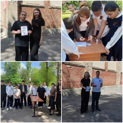 Обучающиеся 10 класса во взаимодействии с председателем школьного самоуправления "Движение первых" совместно с учителями школы в целях содействия воспитанию чувства патриотизма и и гордости за свою Родину, развития интереса к событиям Великой Отечественной войны и в честь 80-летия Победы провели квест " День Победы". В командной игре приняли участие обучающиеся 5-11 классов, было сформировано две команды, ребята назвали свои команды : "Штурм" и "Солдатики". Игра предполагала движение по станциям с помощью маршрутного листа, на каждой станции команды выполняли небольшие задания, а в награду получали жетоны. Станции помогли участникам квеста окунуться в атмосферу военных лет, вспомнить основные события ВОВ или попробовать себя в роли солдат. Игра прошла шумно и весело, ребята с удовольствием принимали участие, в конце игры были подсчитаны жетоны и определены победители. Выиграла команда "Солдатики".