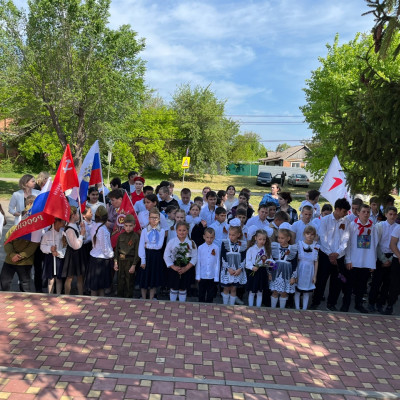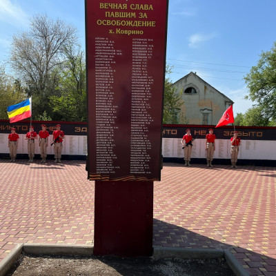 В почетный караул заступил школьный юнармейский отряд "Патриот" возле мемориала павшим воинов. На встрече выступили воспитанники Ковриновского детского сада и учащиеся 2-3 класса.