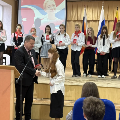 12 декабря, в День Конституции Российской Федерации, состоялось значимое событие для юных активистов Движения Первых нашей школы. Глава Администрации Пролетарского района В.А.Горнич вручил Бурмыгиной Анне и Израиловой Марият паспорта - главный документ гражданина нашей страны. Мероприятие прошло в рамках Всероссийской программы «Мы – граждане России!». Вручение паспортов в такой важный государственный праздник придаёт событию особую торжественность и символичность. Это не просто формальная процедура - это момент вступления во взрослую жизнь, осознания своей гражданской ответственности и принадлежности к великой стране.К каждому паспорту прилагалась Конституция Российской Федерации - основной закон, который определяет права и обязанности каждого гражданина.