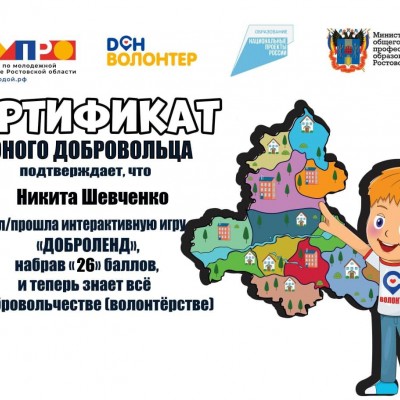 По результатам прохождения онлайн-игры каждый школьник получит сертификат «Юного добровольца» с количеством набранных баллов.